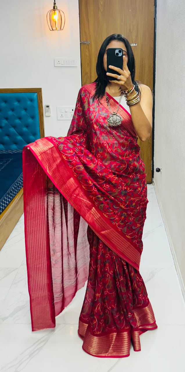 Description-Heavy marsh mellow saree with zari linings and floral print and gold denting zari border all over sarees attached with perfectly matched pallu & blouse peice